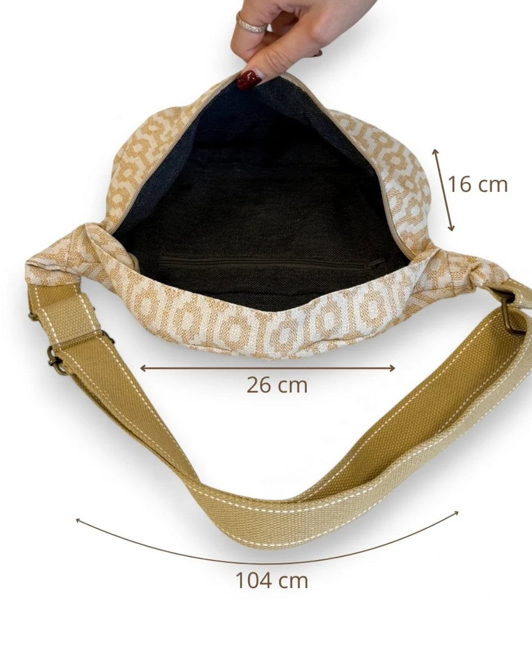 Die Tasche bietet im geräumigen Hauptfach mit Reißverschluss Platz für deine wichtigsten Essentials wie Handy, Geldbörse, Schlüssel, Sonnenbrille oder Lippenpflege. Dank des verstellbaren Schultergurts kannst du die Tasche flexibel als Bauchtasche oder Crossbody Bag tragen – bequem, sicher und stilvoll.