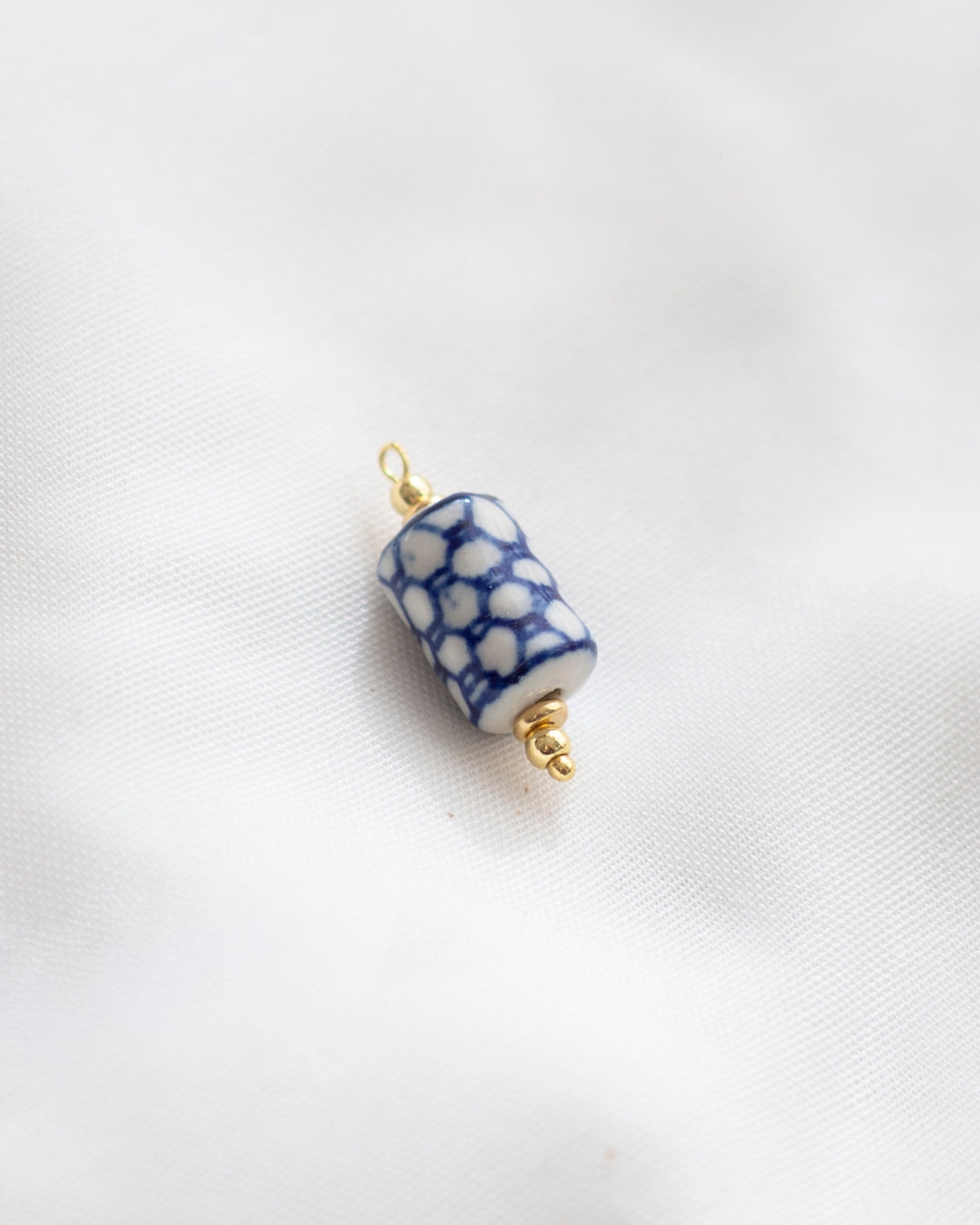 Dieser handbemalte Keramikanhänger bringt mediterranem Flair in dein Schmuckstück. Das geometrische Muster in Blau und Weiß wirkt gleichzeitig klassisch und modern, während die kleinen goldfarbenen Details dem Anhänger eine elegante Note verleihen. Ob an einer feinen Kette, einem Armband oder in Kombination mit anderen Charms – dieses kleine Schmuckstück ist ein echter Hingucker und verleiht deinem Look eine individuelle, künstlerische Ausstrahlung.