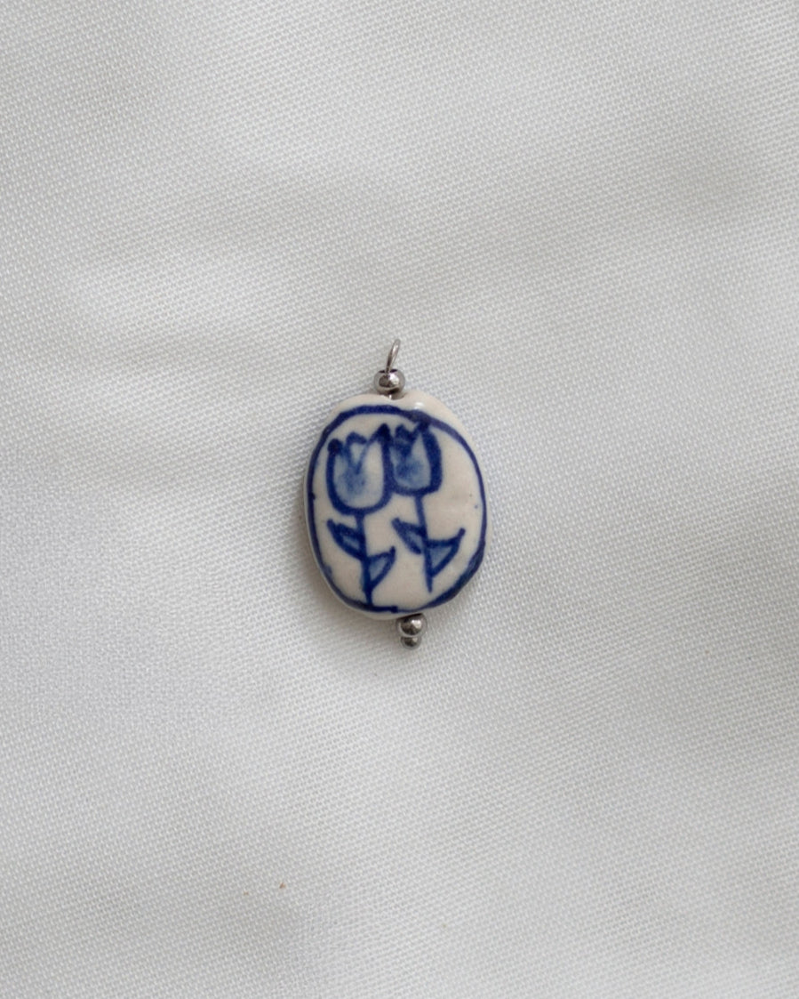 Dieser handbemalte Keramikanhänger bringt eine Portion Vintage-Charme in dein Schmuckstück. Auf dem weißen Anhänger sind zwei dunkelblaue Tulpen abgebildet, die für Frische, Frühling und neue Anfänge stehen. Durch die kleinen goldfarbenen Details wirkt der Anhänger elegant und gleichzeitig verspielt. Ob an einer Kette, einem Armband oder kombiniert mit anderen Charms – dieses kleine Kunstwerk verleiht deinem Look eine individuelle Note und macht ihn zu etwas ganz Besonderem.