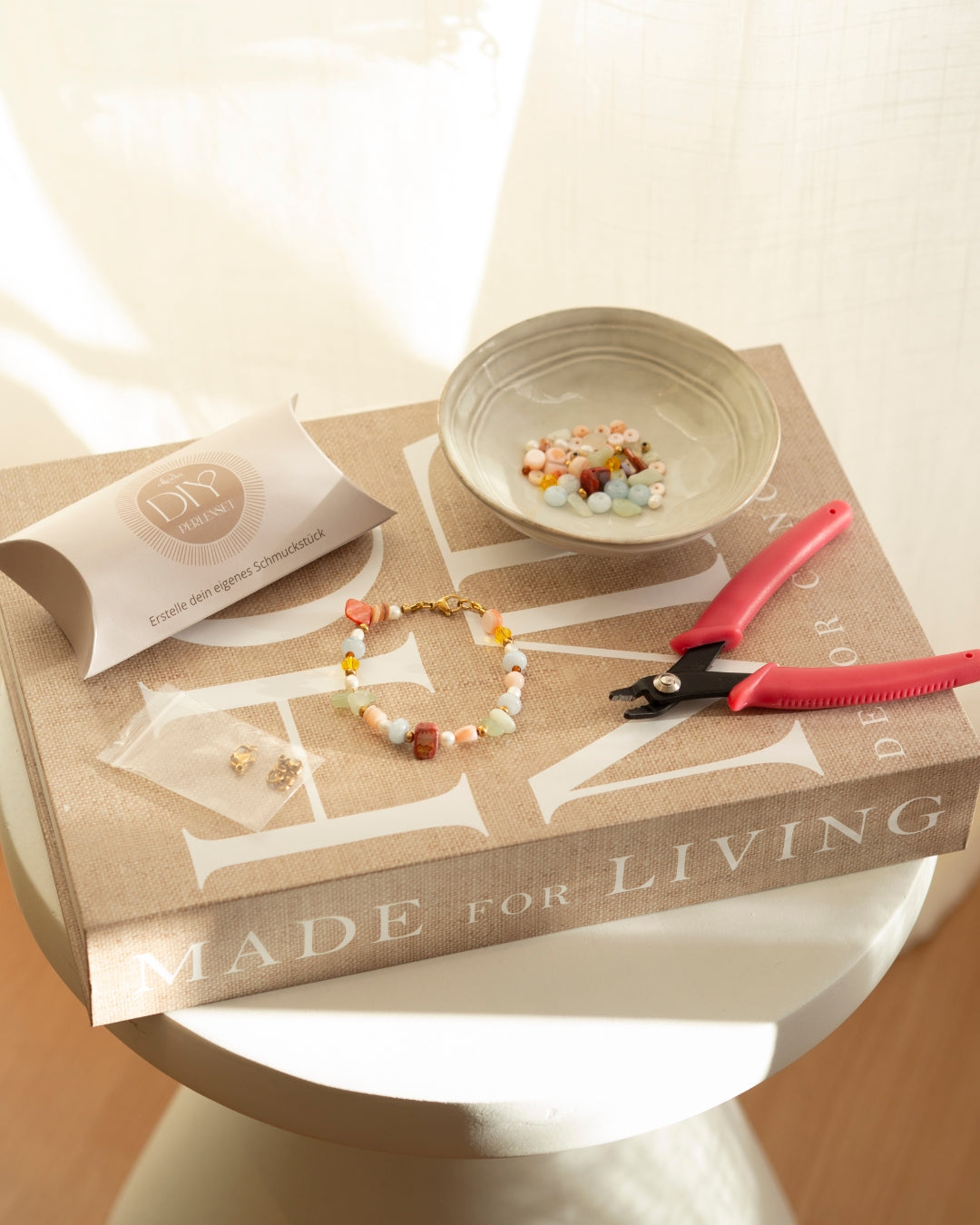 • Für die Herstellung des Armbandes benötigst du eine Quetschzange. Diese kannst du hier in meinem Shop erwerben. Falls du bereits eine Zange zuhause hast, ist das natürlich kein Muss.