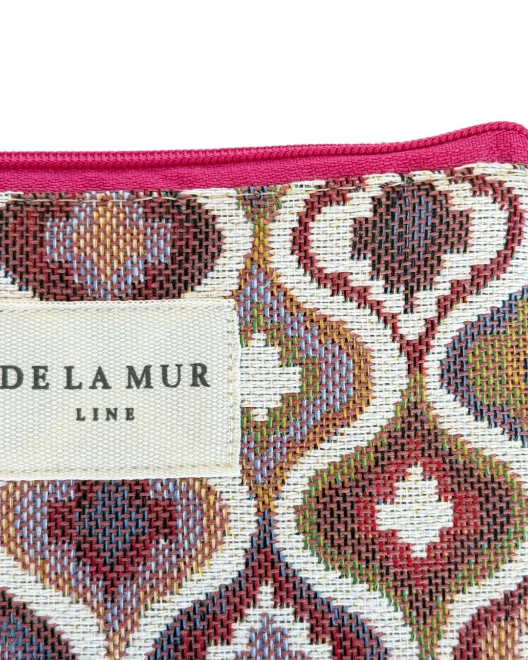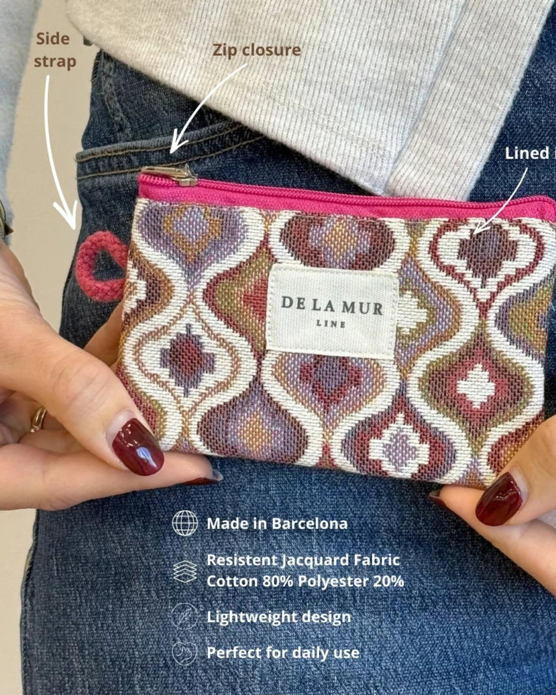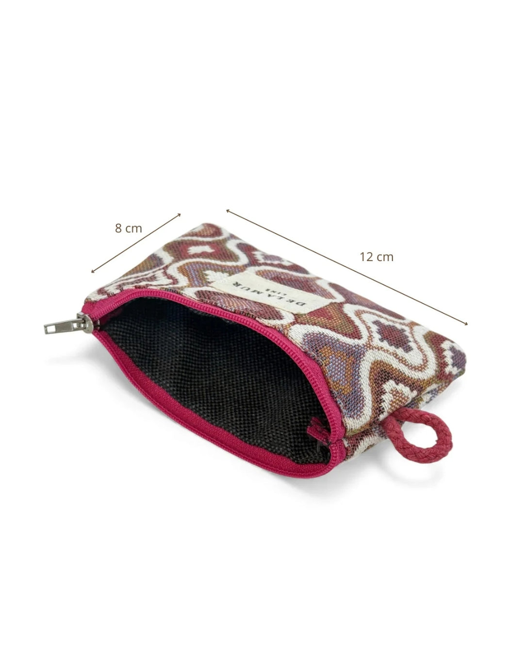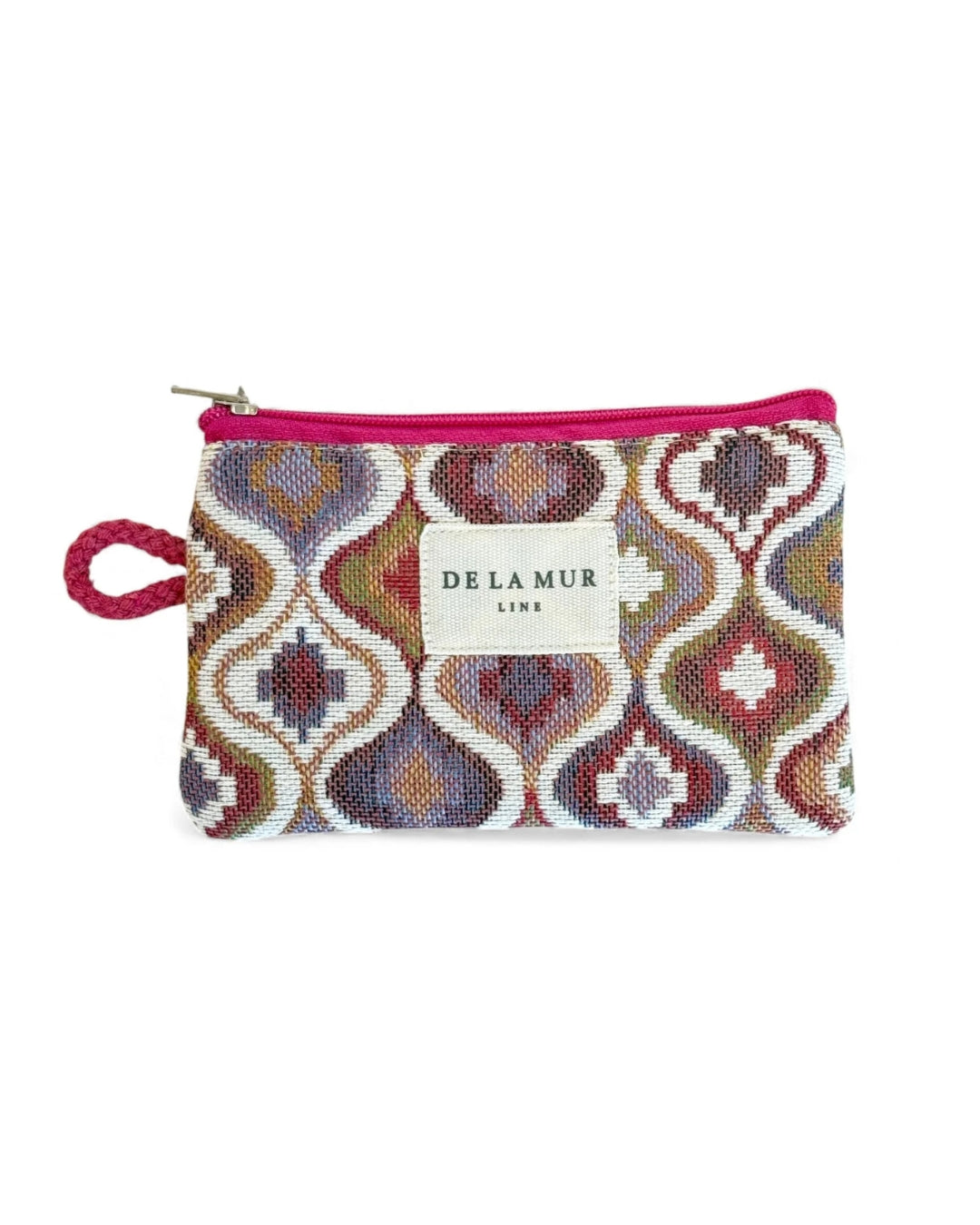 Der hochwertige Jacquard-Stoff mit geschwungenem geometrischem Muster in warmen Bordeaux-, Rosé-, Sand- und Erdtönen verleiht dem Portemonnaie einen eleganten, leicht boho-inspirierten Look.